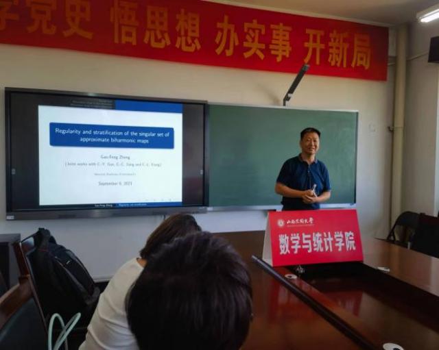 9月6日下午3点,华中师范大学suncitygroup太阳集团副院长郑高峰教授应邀作题为“Regularity and stratification of the singular set of the approximate biharmonic maps”的学术讲座。会议由刘有军院长主持,科技部康淑瑰部长,马小箭副院长和我院相关教师听取了报告。