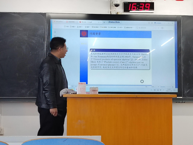 115日下午,黄利忠博士在行知楼302作题为Pro-Banach代数交叉积的表示”的学术讲座。本次讲座由科学技术部和数学与统计学院共同举办,是我校2024年下半年博士论坛系列讲座之一。本次讲座由数学与统计学院副院长马小箭副教授主持,学院部分师生参加了此次学术交流。