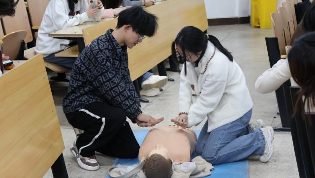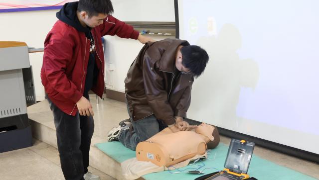 活动现场氛围高涨。在实操演示环节,主讲人借助模拟道具,规范展示心肺复苏动作,吸引众多同学目光。随后,同学们在专业人员指导下,利用人体模型积极参与实操练习,涵盖胸外按压、人工呼吸、海姆立克急救法以及颈椎病弹力带医疗体操等内容。通过亲身体验,同学们对急救知识有了更深刻的理解。