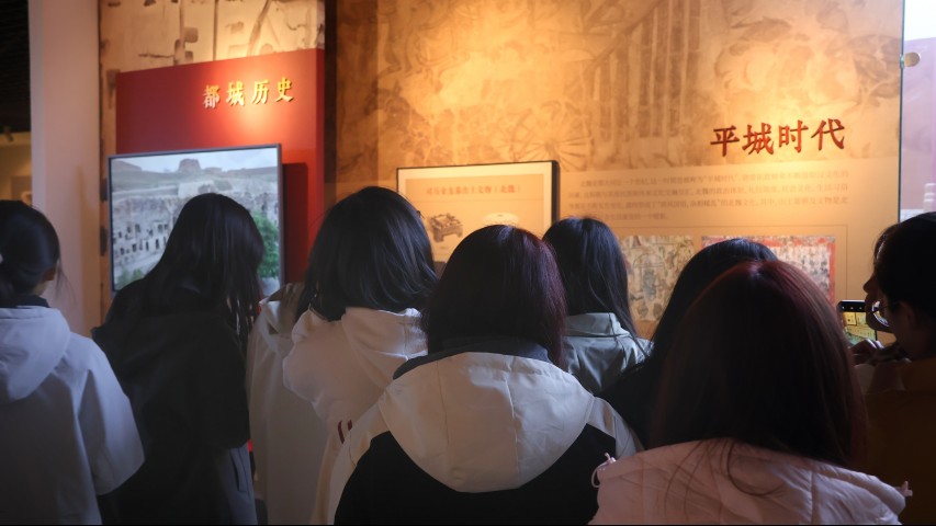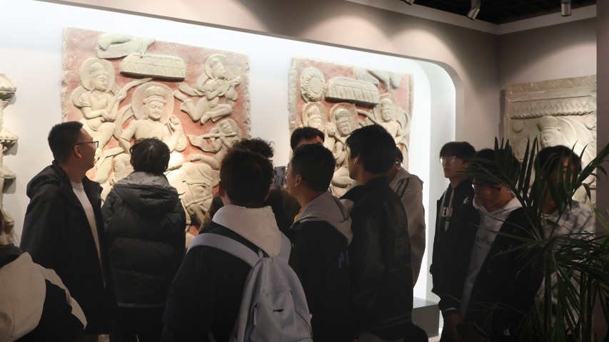 在讲解员的引导下,师生们围绕特色文创、石窟模型与古老典籍展开学习,系统梳理大同古都的历史脉络、云冈石窟的艺术精髓及“云冈学”的学术成果。讲解员以实物展品为依托、历史图片为佐证,用生动语言串联起大同的历史变迁、石窟雕刻技艺及背后的文化故事,让古代工匠的巧夺天工与中华文脉的博大精深直观呈现在眼前。在“云冈真容”展区,北魏时期的精美石窟造像引发师生驻足惊叹——千年凿石而成的纹路里,不仅藏着雕塑艺术的辉煌,更诉说着古老文明的传承密码。