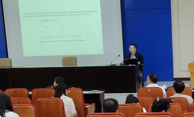 赵虎副教授从罗马尼亚Marandache 教授于1998年首次提出中智集的概念出发首先介绍了相关研究成果和未解决的相关问题,随后详细讲解了他和合作者研究中智集的悲观多粒度粗糙近似算子的格结构方法。特别是,在一维的情况下,对于特殊的单值中智关系,上中智粗糙近似算子和下中智粗糙近似算子之间的完备格同构关系被证明。报告结束后与在座师生进行了互动交流,报告气氛热烈。