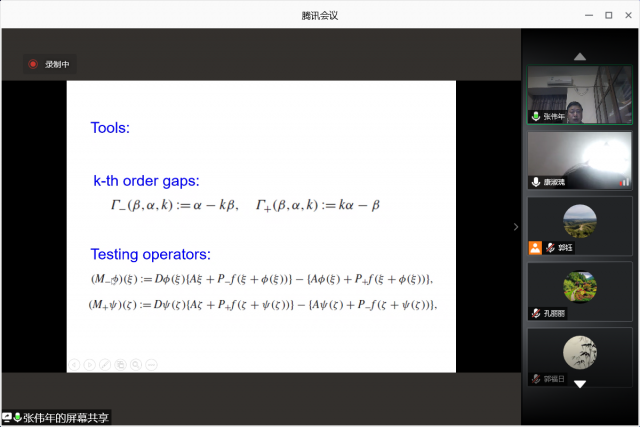 报告详细讲解了不变流形的研究历史和现状,对有谱隙和没有谱隙两种不同情形进行了讲解。随后介绍了弱双曲流行的逼近解法,并给出了在没有谱隙条件下中心流行上的不变子流行的存在性和光滑性证明。报告深入浅出,生动有趣。报告结束后,张教授与老师们进行了在线互动交流。