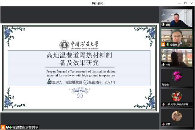 4月15日下午16:00,中国矿业大学安全工程学院程健维教授应邀作了题为“高地温巷道隔热材料制备及效果研究”的线上学术报告。我院40余名师生听取了报告,报告会由副院长郭钰主持。