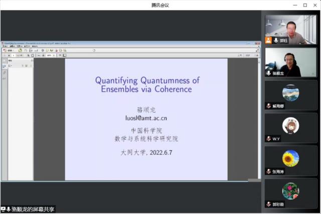 6月7日下午15:00,中科院数学与系统科学研究院应用数学研究所所长骆顺龙研究员应邀作了题为“Quantifying Quantumness of Ensembles via Coherence”的线上学术讲座。我院40余名相关专业教师和部分联合培养的硕士研究生听取了报告,报告会由副院长郭钰主持。