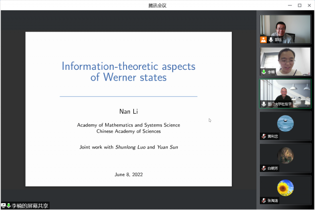 6月7日下午15:00,中科院数学与系统科学研究院李楠副研究员应邀作了题为“Information-theoretic aspects of Werner states”的线上学术讲座。我院40余名相关专业教师和部分联合培养的硕士研究生听取了报告,报告会由副院长郭钰主持。