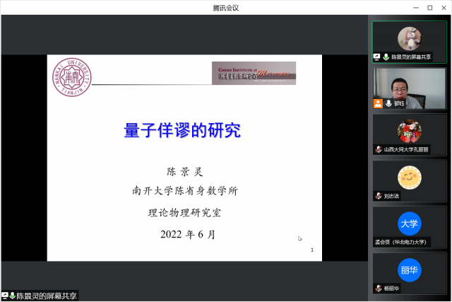 6月10日下午15:00,南开大学陈省身数学研究所陈景灵教授应邀作了题为“量子佯谬的研究”的线上学术讲座。我院及兄弟院校70余名相关专业教师和部分联合培养的硕士研究生听取了讲座,报告会由副院长郭钰主持。