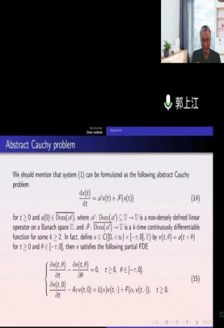 郭上江教授先介绍了一般巴拿赫空间中半线性泛函微分方程的等变范式。然后针对一般Banach空间中半线性FDEs的等变Hopf分岔定理,分岔周期解分支的存在性、稳定性和分岔方向的判据问题,做了系统而深刻的分析与介绍。随后通过介绍二维圆盘上的时滞Ginzburg-Landau方程的例子,使大家更好理解报告中提及的方法和理论。随后,部分教师和郭教授就报告中的问题开展了深入交流,大家表示非常高兴有机会认识郭教授,能及时了解了这么前沿的科学问题,并就下一步结合研究对象如何开展学术研究达成了高度契合。